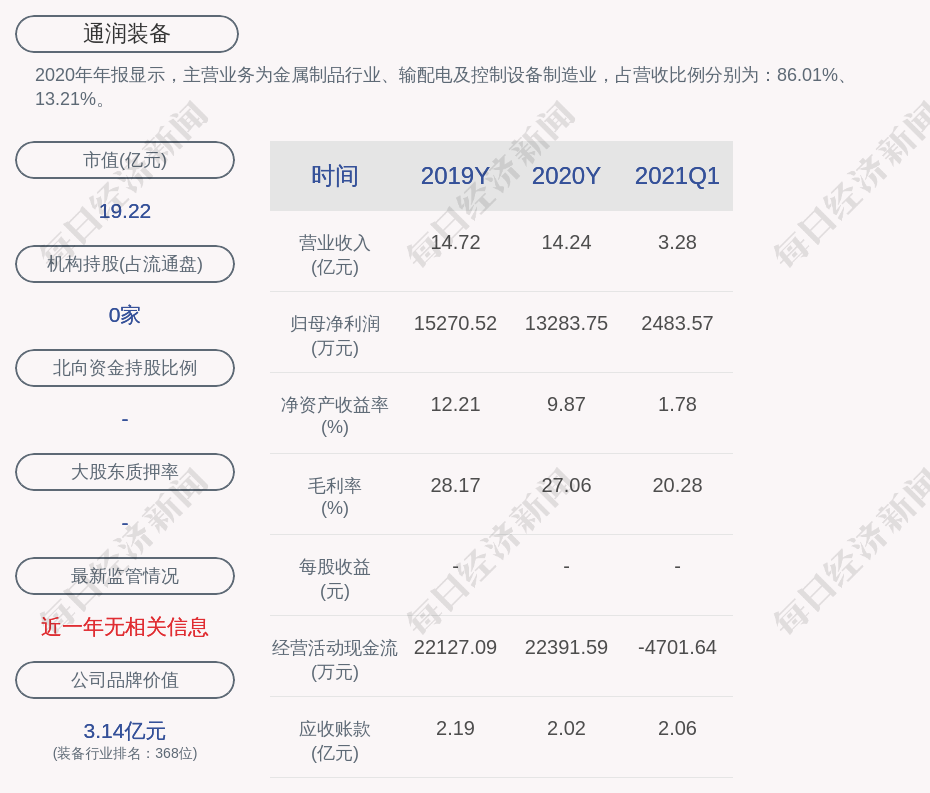 2020年年报显示,通润装备的主营业务为金属制品行业、输配电及控制设备制造业,占营收比例分别为:86.01%、13.21%。