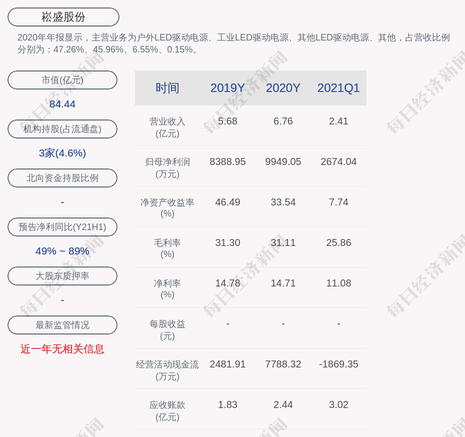 2020年年报显示,崧盛股份的主营业务为户外LED驱动电源、工业LED驱动电源、其他LED驱动电源、其他,占营收比例分别为:47.26%、45.96%、6.55%、0.15%。