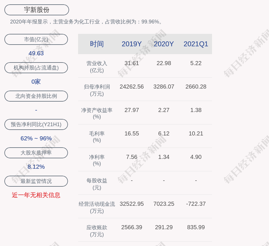 2020年年报显示,宇新股份的主营业务为化工行业,占营收比例为:99.96%。