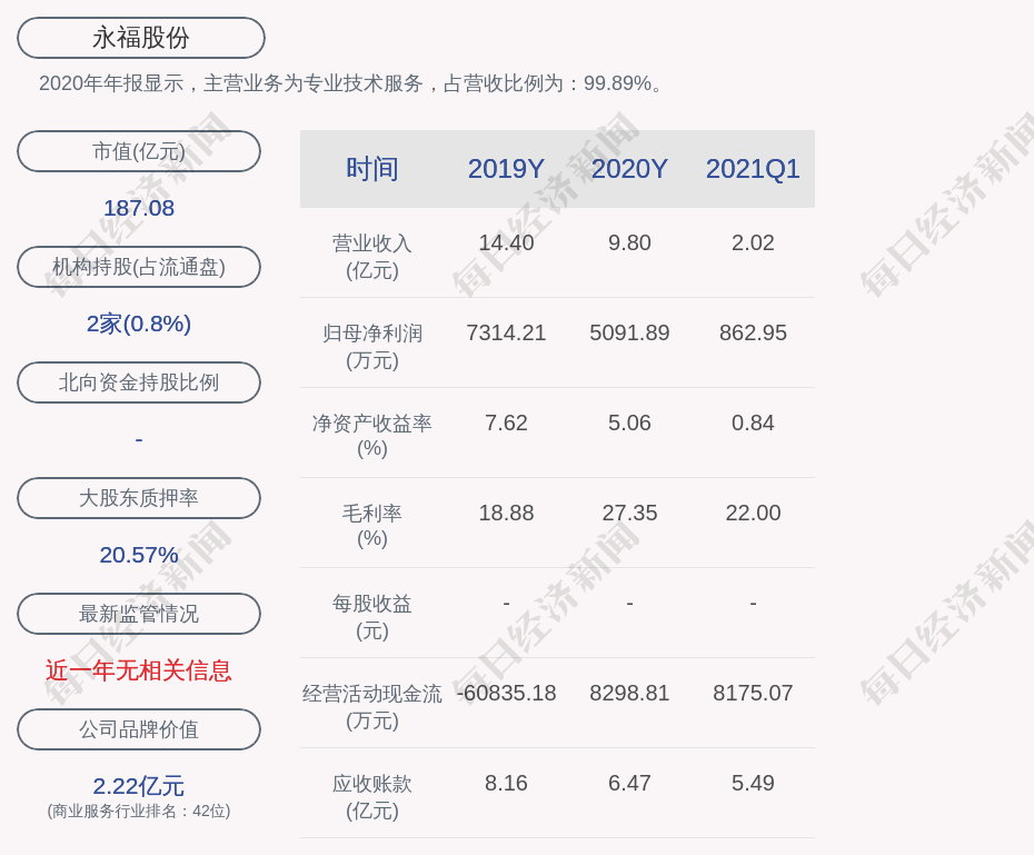 2020年年报显示,永福股份的主营业务为专业技术服务,占营收比例为:99.89%。