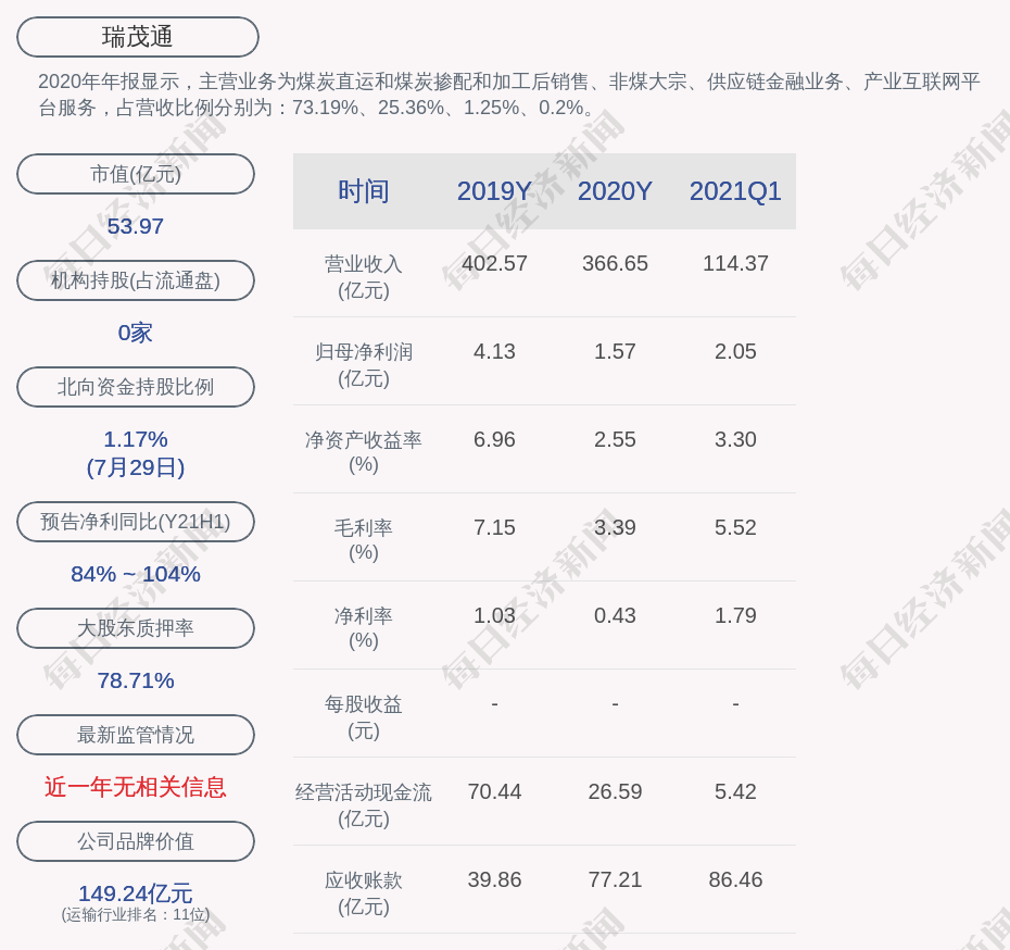 2020年年报显示,瑞茂通的主营业务为煤炭直运和煤炭掺配和加工后销售、非煤大宗、供应链金融业务、产业互联网平台服务,占营收比例分别为:73.19%、25.36%、1.25%、0.2%。