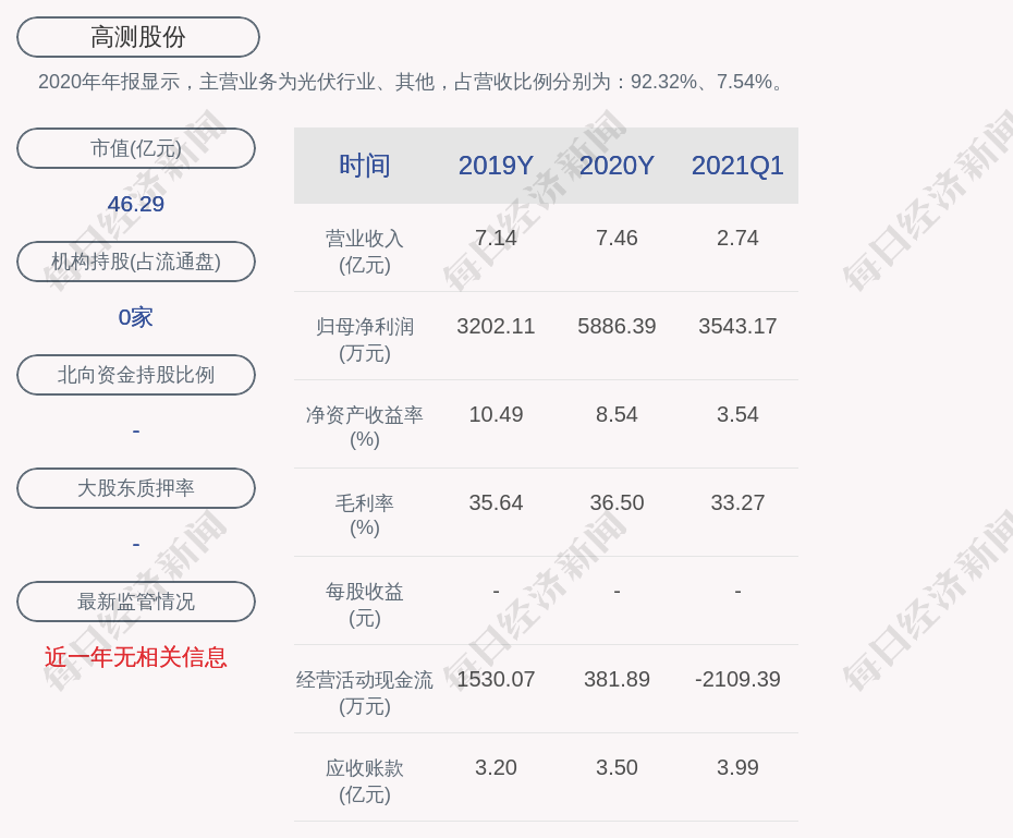 2020年年报显示,高测股份的主营业务为光伏行业、其他。