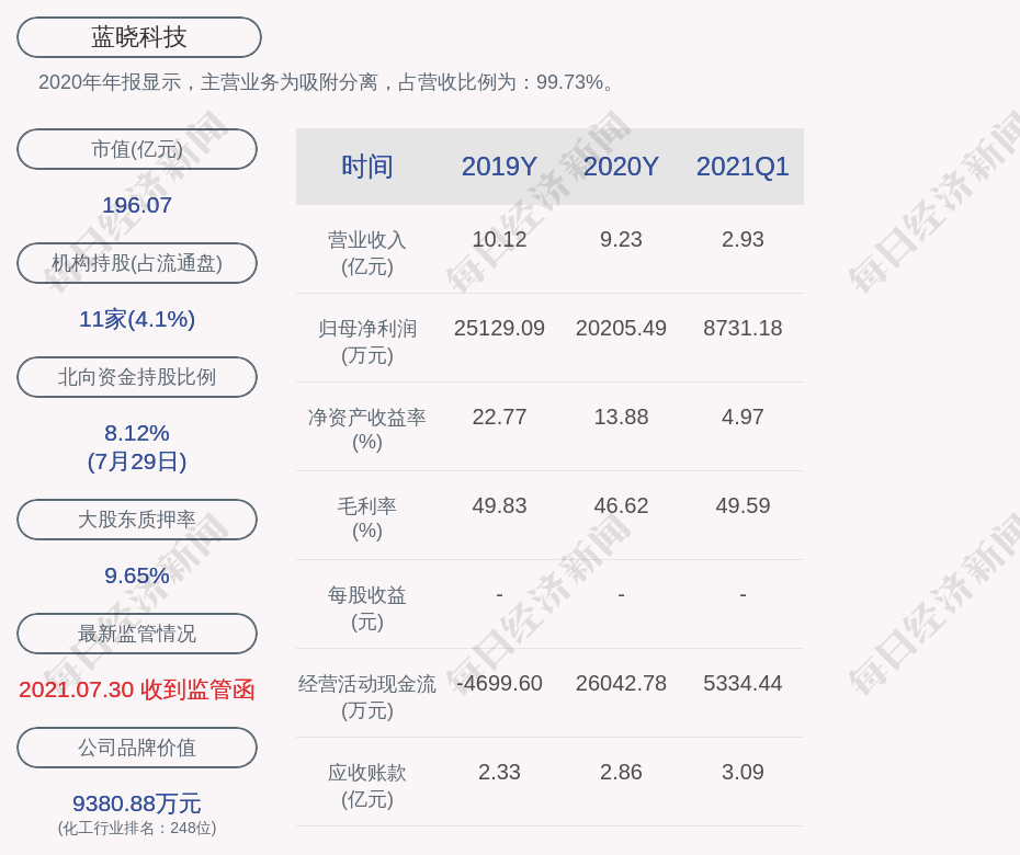 2020年年报显示,蓝晓科技的主营业务为吸附分离,占营收比例为:99.73%。