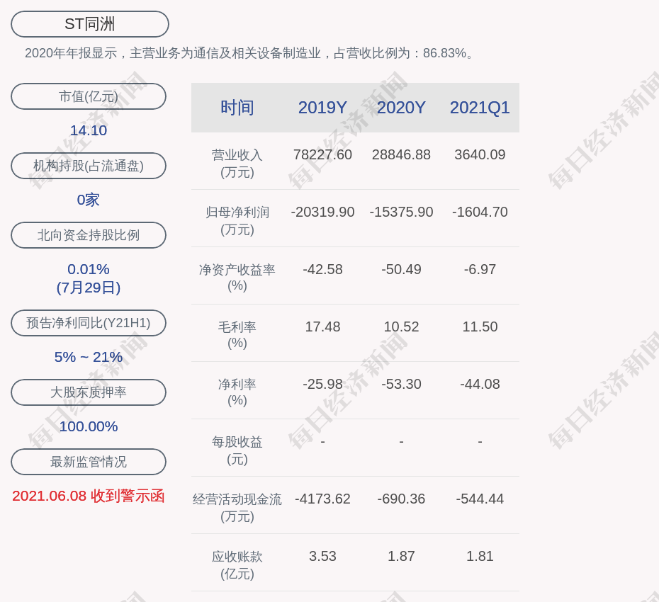 2020年年报显示,ST同洲的主营业务为通信及相关设备制造业,占营收比例为:86.83%。