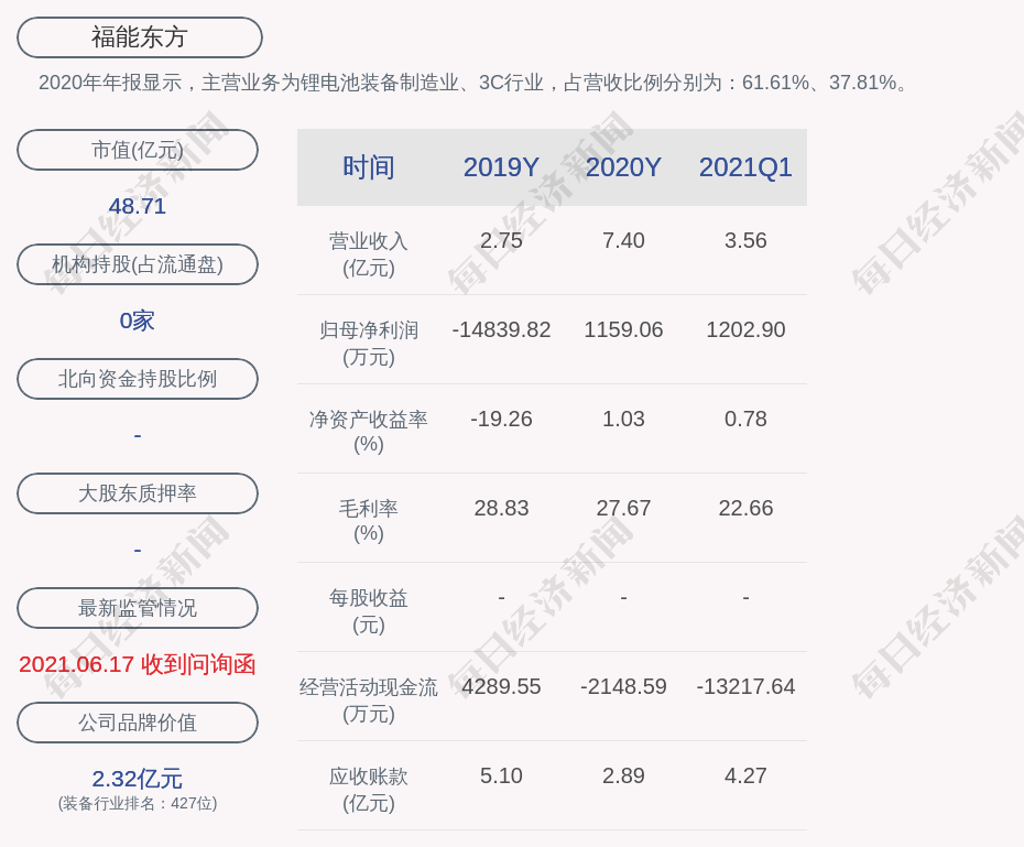 2020年年报显示,福能东方的主营业务为锂电池装备制造业、3C行业,占营收比例分别为:61.61%、37.81%。