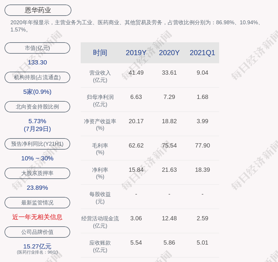 2020年年报显示,恩华药业的主营业务为工业、医药商业、其他贸易及劳务,占营收比例分别为:86.98%、10.94%、1.57%。