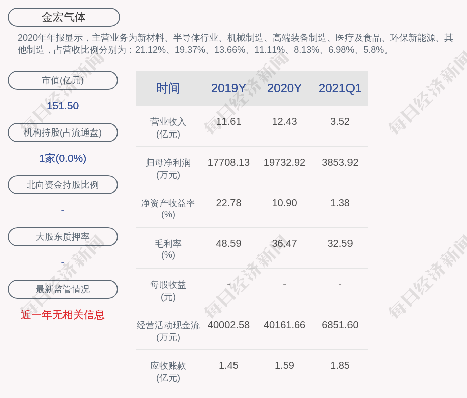 2020年年报显示,金宏气体的主营业务为新材料、半导体行业、机械制造、高端装备制造、医疗及食品、环保新能源、其他制造,占营收比例分别为:21.12%、19.37%、13.66%、11.11%、8.13%、6.98%、5.8%。