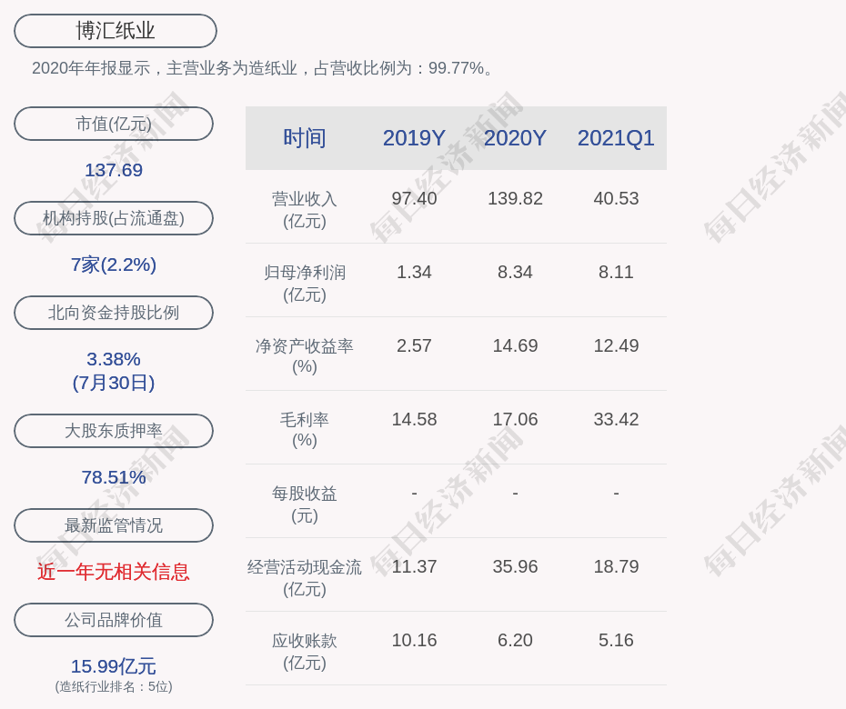 2020年年报显示,博汇纸业的主营业务为造纸业,占营收比例为:99.77%。