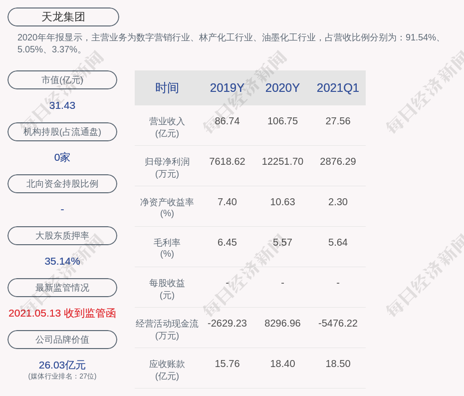 2020年年报显示,天龙集团的主营业务为数字营销行业、林产化工行业、油墨化工行业,占营收比例分别为:91.54%、5.05%、3.37%。