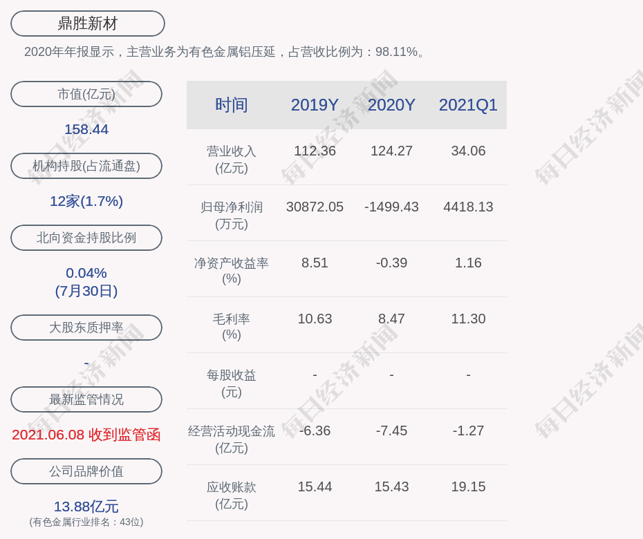 2020年年报显示,鼎胜新材的主营业务为有色金属铝压延,占营收比例为:98.11%。