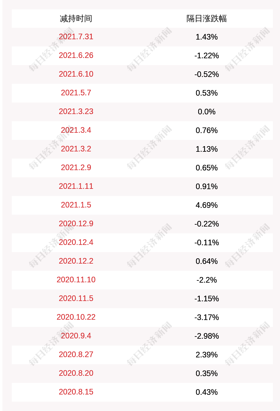 1. 南卫股份上次发布减持公告是2021年07月31日,第二个交易日上涨1.43%,南卫股份近一年共发布21次减持类公告。更多关键信息,请搜索“道达号”。