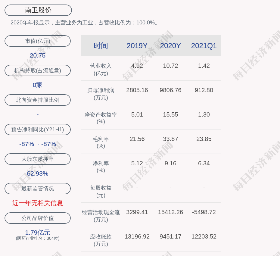 2020年年报显示,南卫股份的主营业务为工业,占营收比例为:100.0%。