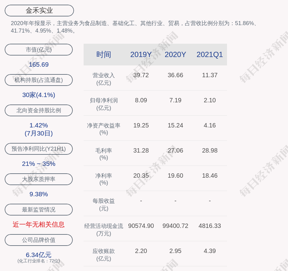 2020年年报显示,金禾实业的主营业务为食品制造、基础化工、其他行业、贸易,占营收比例分别为:51.86%、41.71%、4.95%、1.48%。
