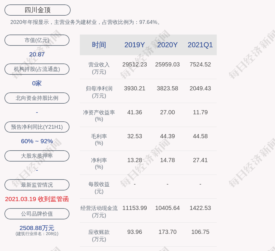 2020年年报显示,四川金顶的主营业务为建材业,占营收比例为:97.64%。