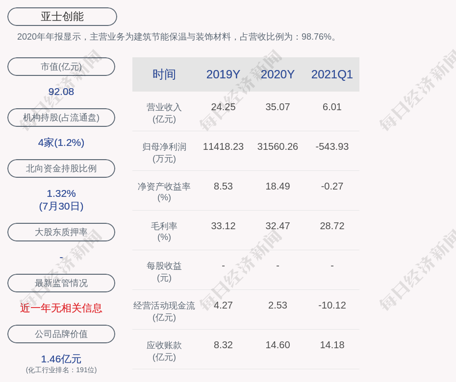 2020年年报显示,亚士创能的主营业务为建筑节能保温与装饰材料,占营收比例为:98.76%。