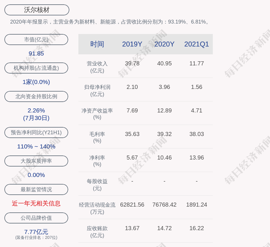 2020年年报显示,沃尔核材的主营业务为新材料、新能源,占营收比例分别为:93.19%、6.81%。