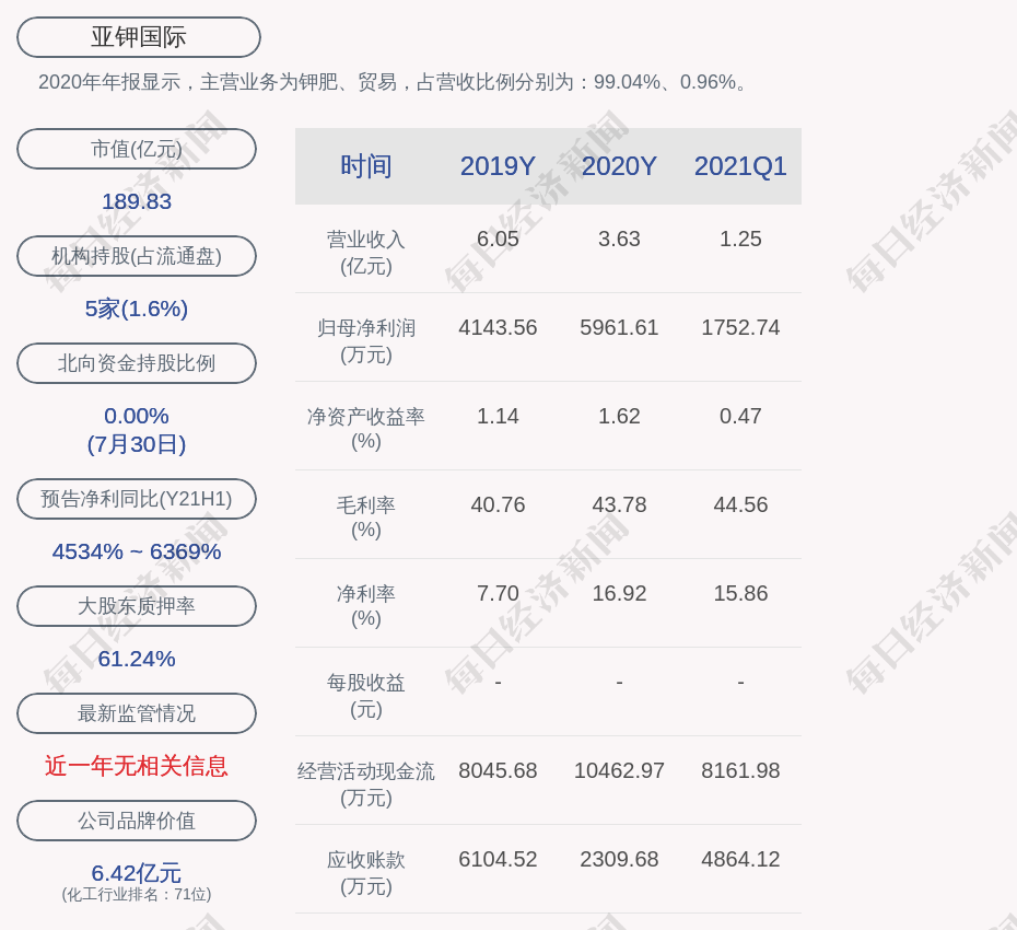 2020年年报显示,亚钾国际的主营业务为钾肥、贸易,占营收比例分别为:99.04%、0.96%。