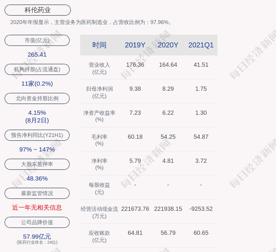 2020年年报显示,科伦药业的主营业务为医药制造业,占营收比例为:97.96%。