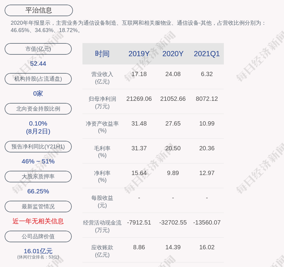 2020年年报显示,平治信息的主营业务为通信设备制造、互联网和相关服物业、通信设备-其他,占营收比例分别为:46.65%、34.63%、18.72%。