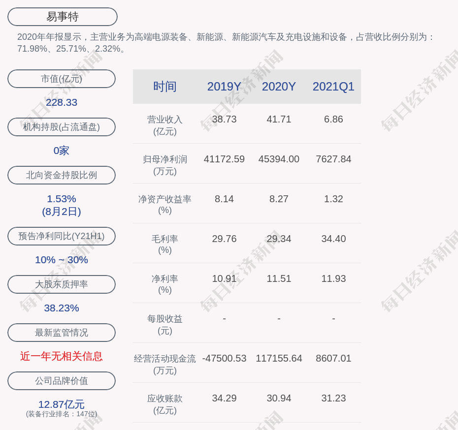 2020年年报显示,易事特的主营业务为高端电源装备、新能源、新能源汽车及充电设施和设备,占营收比例分别为:71.98%、25.71%、2.32%。