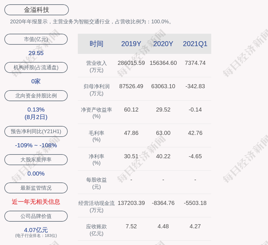 2020年年报显示,金溢科技的主营业务为智能交通行业,占营收比例为:100.0%。