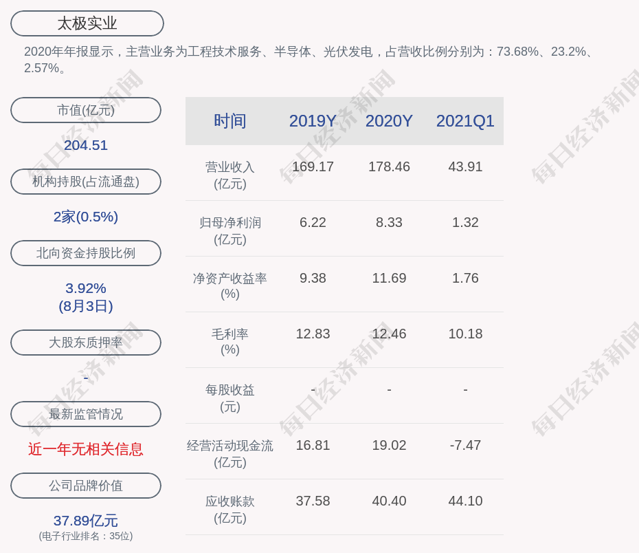 2020年年报显示,太极实业的主营业务为工程技术服务、半导体、光伏发电,占营收比例分别为:73.68%、23.2%、2.57%。