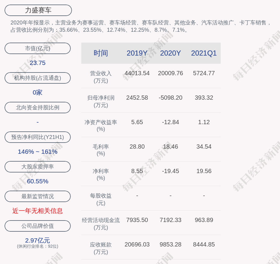 2020年年报显示,力盛赛车的主营业务为赛事运营、赛车场经营、赛车队经营、其他业务、汽车活动推广、卡丁车销售,占营收比例分别为:35.66%、23.55%、12.74%、12.25%、8.7%、7.1%。