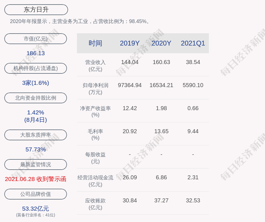 2020年年报显示,东方日升的主营业务为工业,占营收比例为:98.45%。
