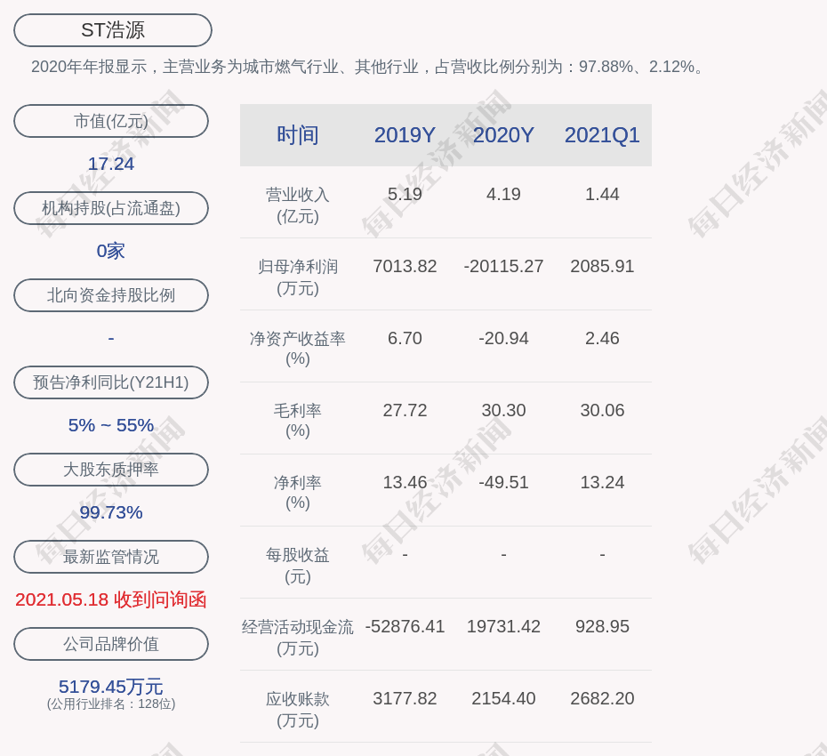 2020年年报显示,ST浩源的主营业务为城市燃气行业、其他行业,占营收比例分别为:97.88%、2.12%。