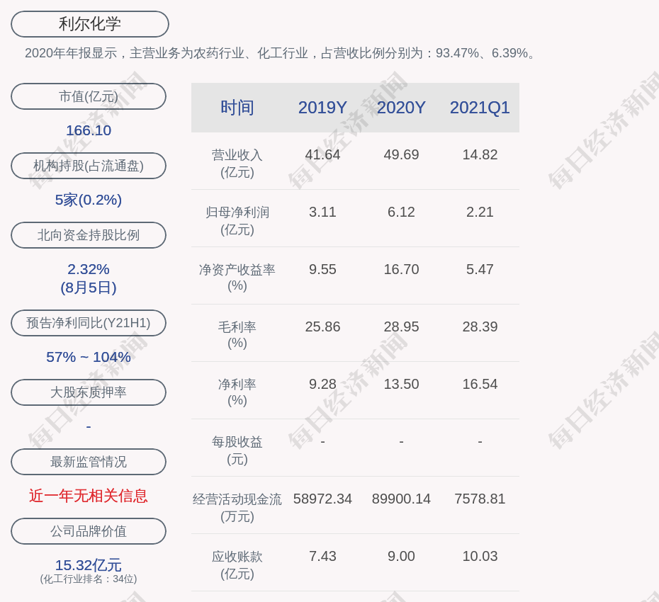 2020年年报显示,利尔化学的主营业务为农药行业、化工行业,占营收比例分别为:93.47%、6.39%。