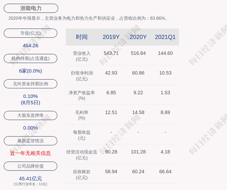 2020年年报显示,浙能电力的主营业务为电力和热力生产和供应业,占营收比例为:83.86%。