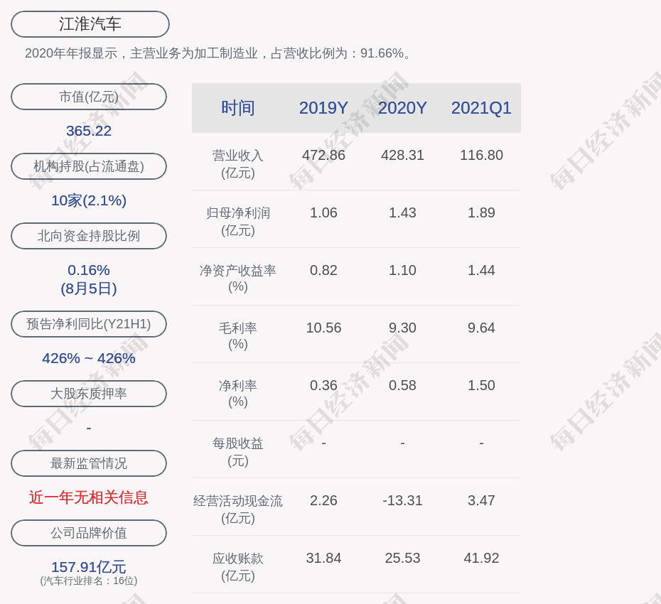 2020年年报显示,江淮汽车的主营业务为加工制造业,占营收比例为:91.66%。