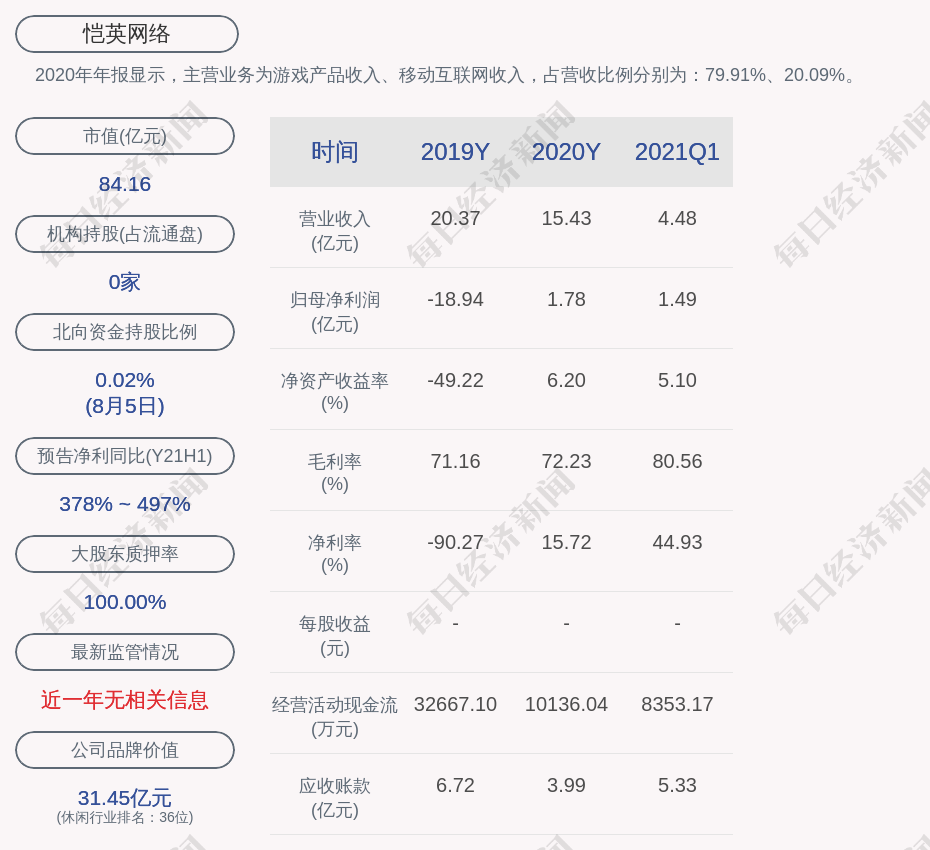 2020年年报显示,恺英网络的主营业务为游戏产品收入、移动互联网收入,占营收比例分别为:79.91%、20.09%。
