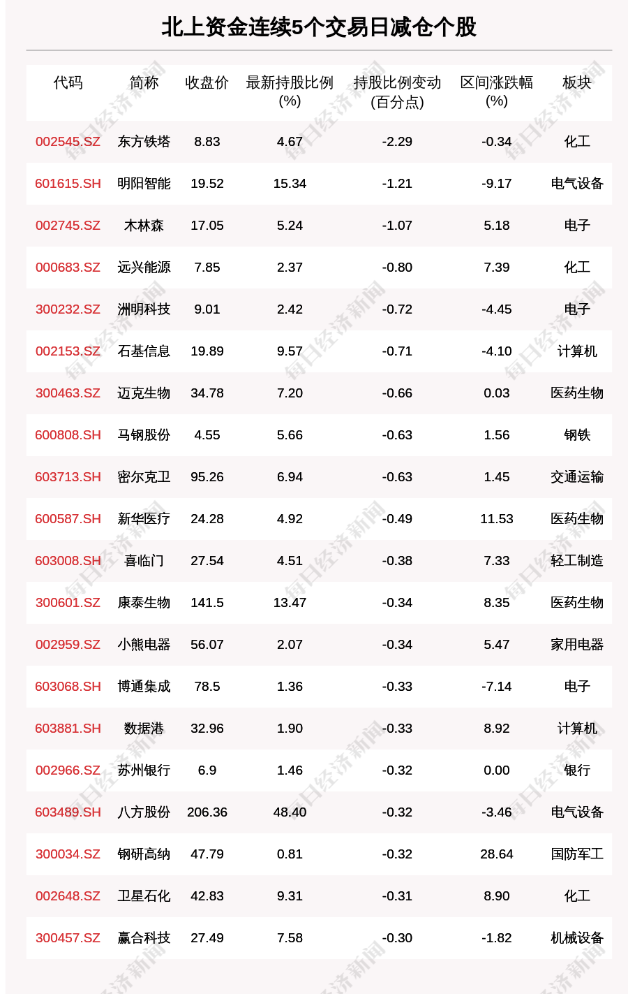 每经AI快讯,8月9日,北上资金连续5个交易日卖出43个股。北上资金连续5个交易日减仓个股中,东方铁塔(002545.SZ,收盘价:8.83元)减持比例增幅最大,5个交易日减持2.29百分点,其他跌幅较大的个股包括明阳智能(601615.SH,收盘价:19.52元)、木林森(002745.SZ,收盘价:17.05元)、远兴能源(000683.SZ,收盘价:7.85元),分别减持1.21个百分点、1.07个百分点、0.80个百分点。