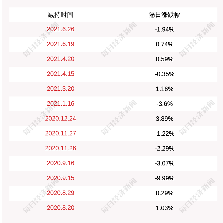 2. 振江股份上次发布减持公告是2021年06月26日,第二个交易日下跌1.94%,振江股份近一年共发布14次减持类公告。更多关键信息,请搜索“道达号”。