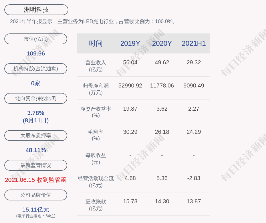 2021年半年报显示,洲明科技的主营业务为LED光电行业,占营收比例为:100.0%。