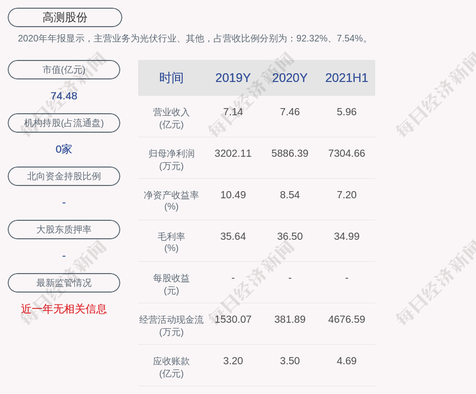 2020年年报显示,高测股份的主营业务为光伏行业、其他,占营收比例分别为:92.32%、7.54%。
