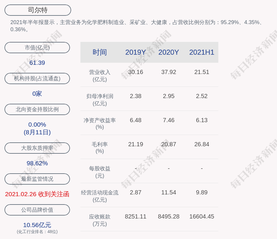 2021年半年报显示,司尔特的主营业务为化学肥料制造业、采矿业、大健康,占营收比例分别为:95.29%、4.35%、0.36%。