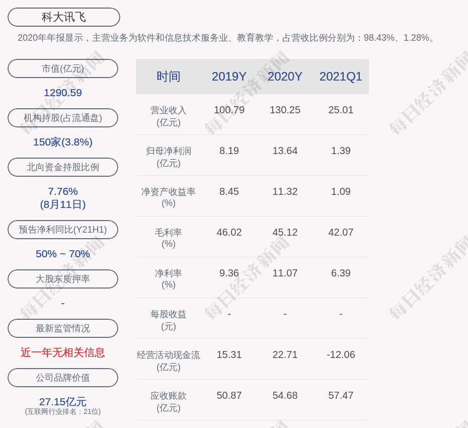 2020年年报显示,科大讯飞的主营业务为软件和信息技术服务业、教育教学,占营收比例分别为:98.43%、1.28%。