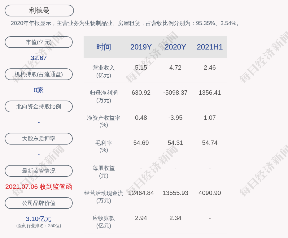 2020年年报显示,利德曼的主营业务为生物制品业、房屋租赁,占营收比例分别为:95.35%、3.54%。