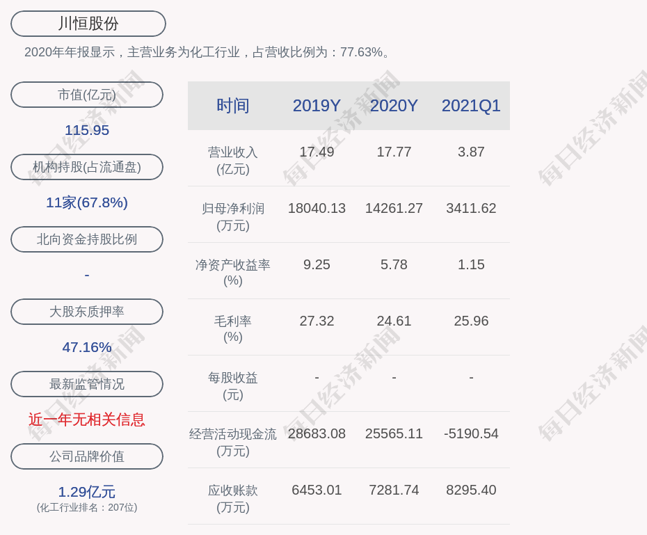 2020年年报显示,川恒股份的主营业务为化工行业,占营收比例为:77.63%。