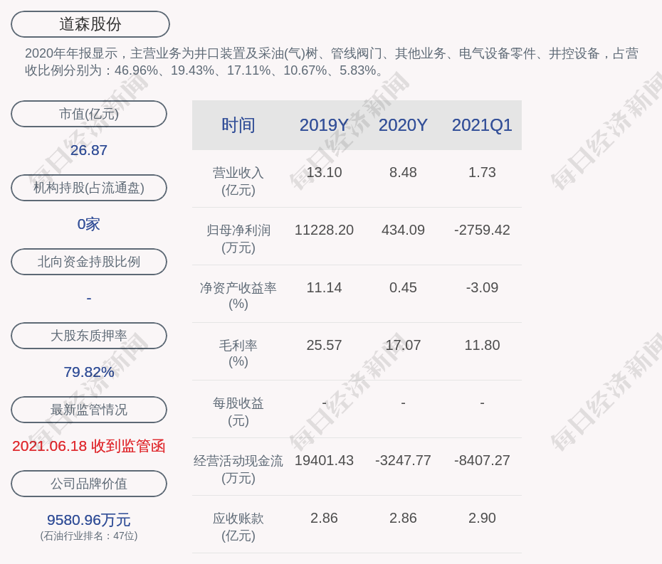 2020年年报显示,道森股份的主营业务为井口装置及采油(气)树、管线阀门、其他业务、电气设备零件、井控设备。