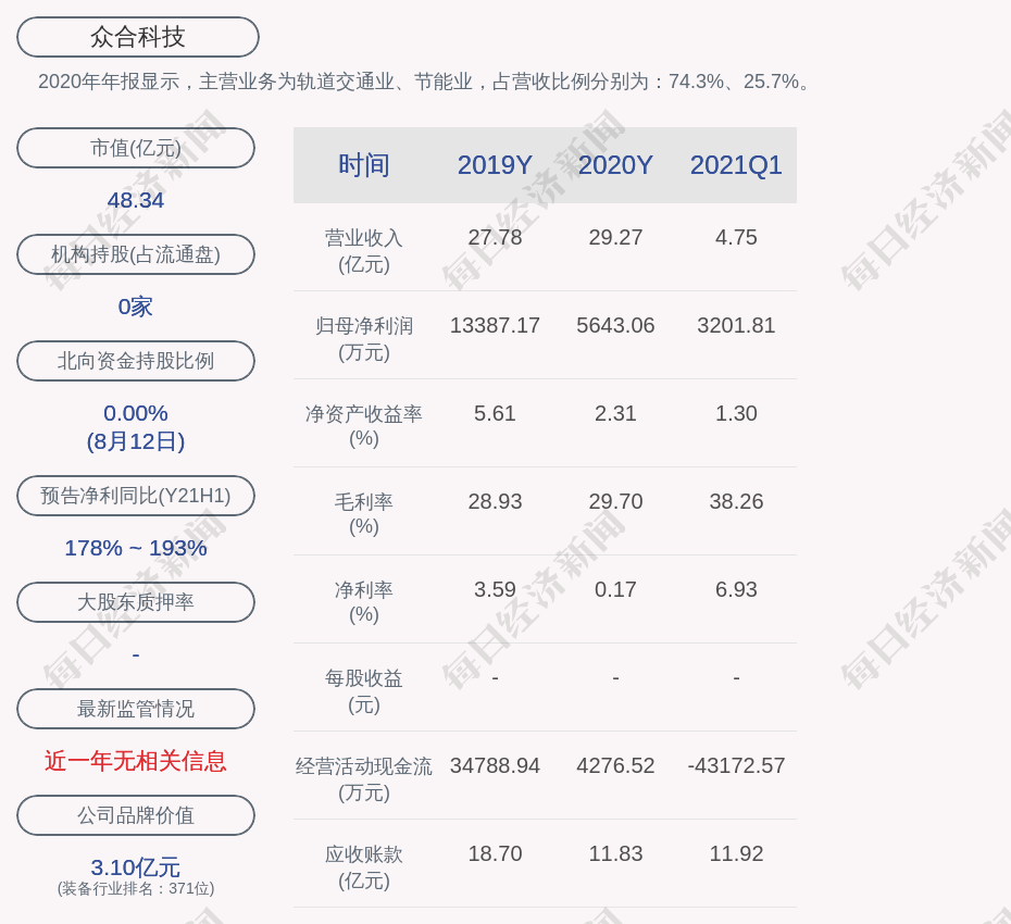 2020年年报显示,众合科技的主营业务为轨道交通业、节能业,占营收比例分别为:74.3%、25.7%。