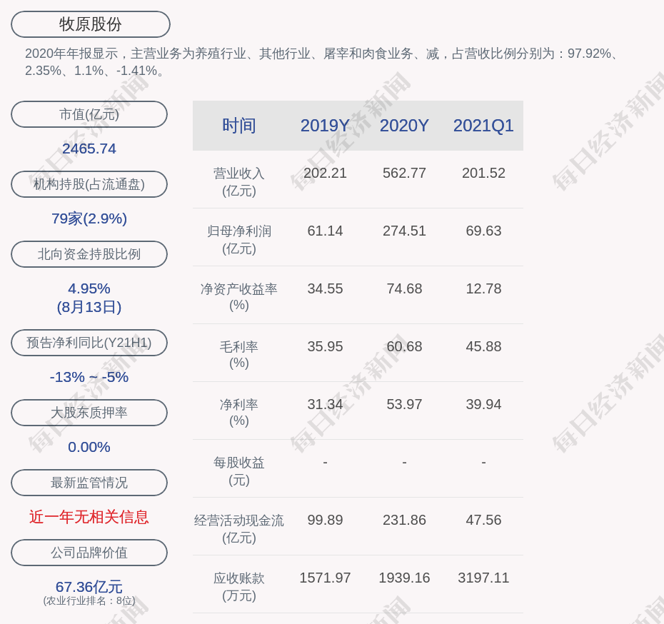 2020年年报显示,牧原股份的主营业务为养殖行业、其他行业、屠宰和肉食业务、减,占营收比例分别为:97.92%、2.35%、1.1%、-1.41%。