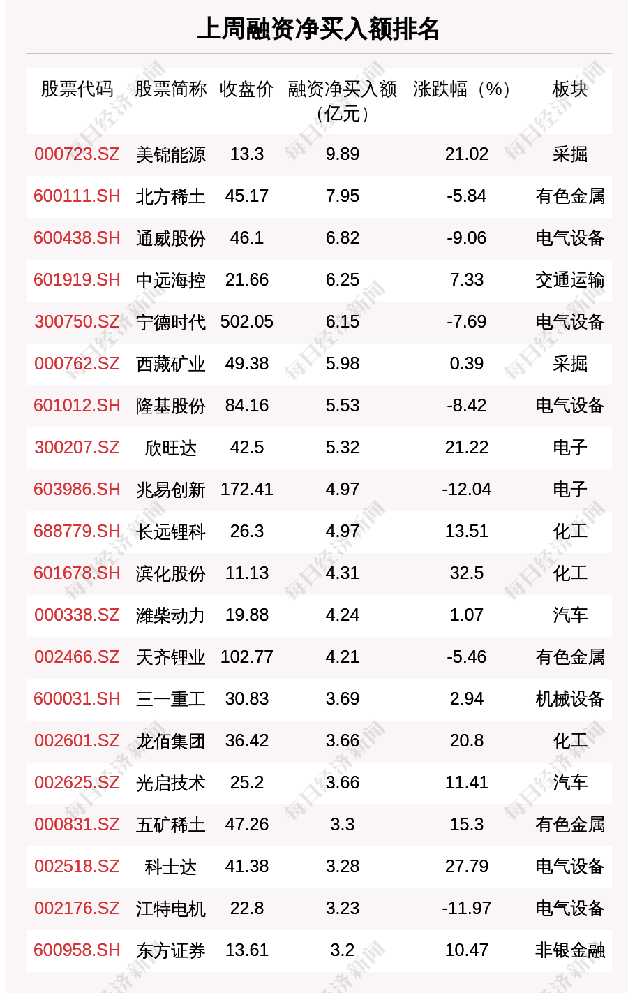上周两市共有1041只个股有融资资金净买入,共有0只个股净买入金额超10亿元,其中美锦能源、北方稀土、通威股份排名前三,买入金额分别为9.89亿元、7.95亿元、6.82亿元。