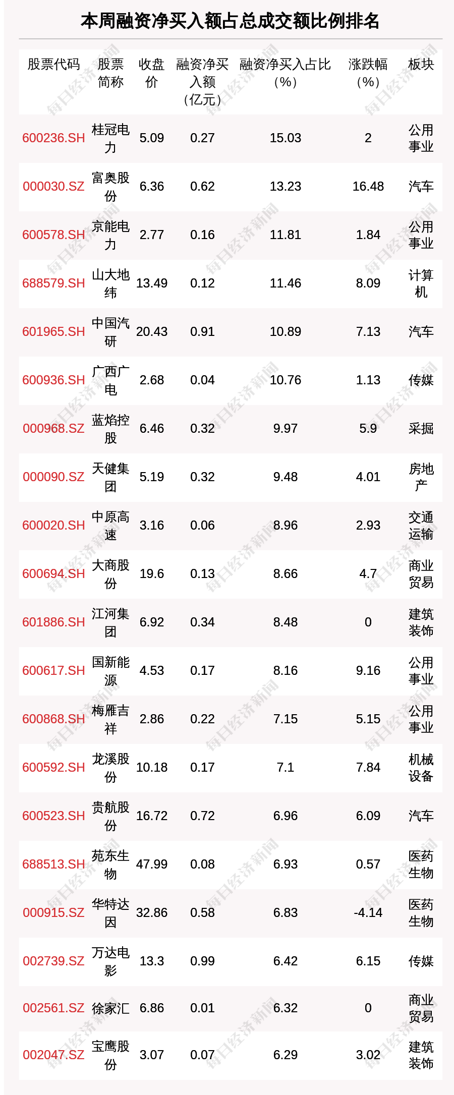 两市共有6只股票融资净买入额占总成交金额比例超10%,其中桂冠电力、富奥股份、京能电力排名前三,占比分别为15.03%、13.23%、11.81%。