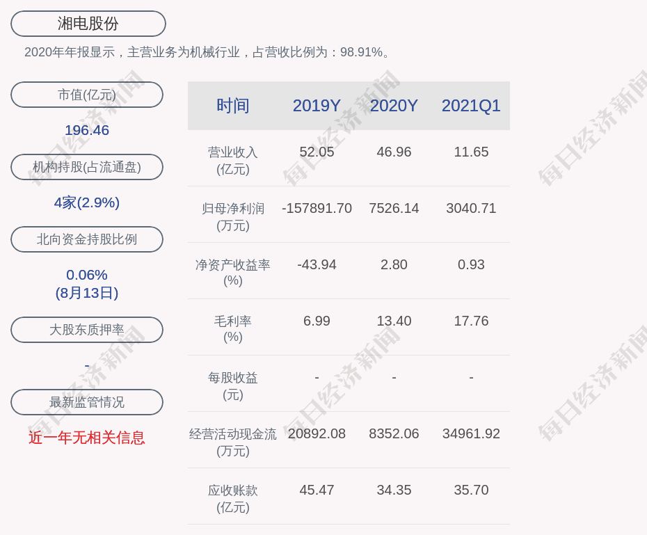 2020年年报显示,湘电股份的主营业务为机械行业,占营收比例为:98.91%。
