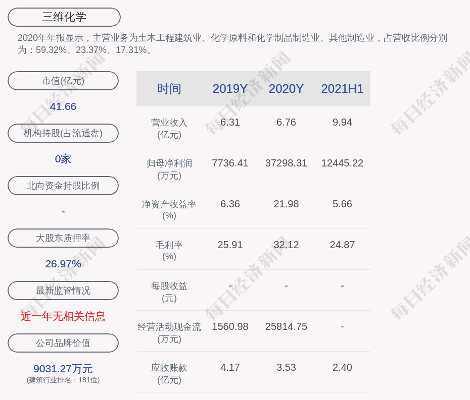 2020年年报显示,三维化学的主营业务为土木工程建筑业、化学原料和化学制品制造业、其他制造业,占营收比例分别为:59.32%、23.37%、17.31%。