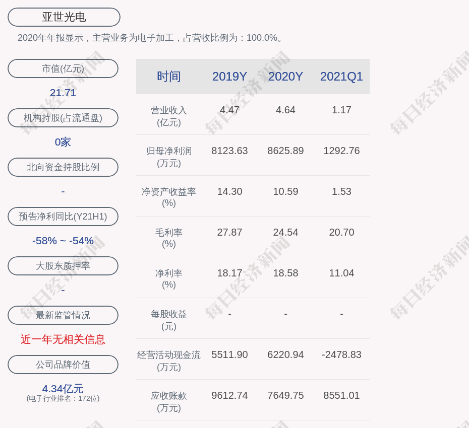 2020年年报显示,亚世光电的主营业务为电子加工。