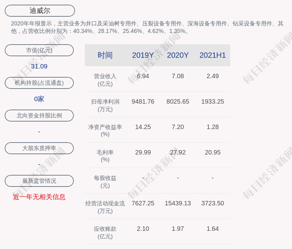 2020年年报显示,迪威尔的主营业务为井口及采油树专用件、压裂设备专用件、深海设备专用件、钻采设备专用件、其他,占营收比例分别为:40.34%、28.17%、25.46%、4.62%、1.35%。